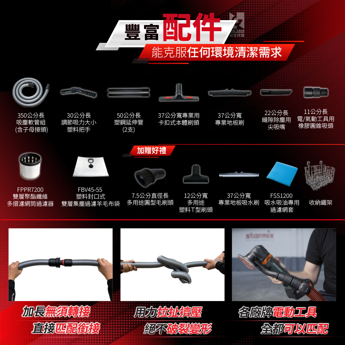 | 防爆軟管 | 歷經最嚴格拉扯測試的工業級多種耐磨材質吸塵軟管,耐破裂、耐擠壓、耐熱寒、耐酸鹼。 |