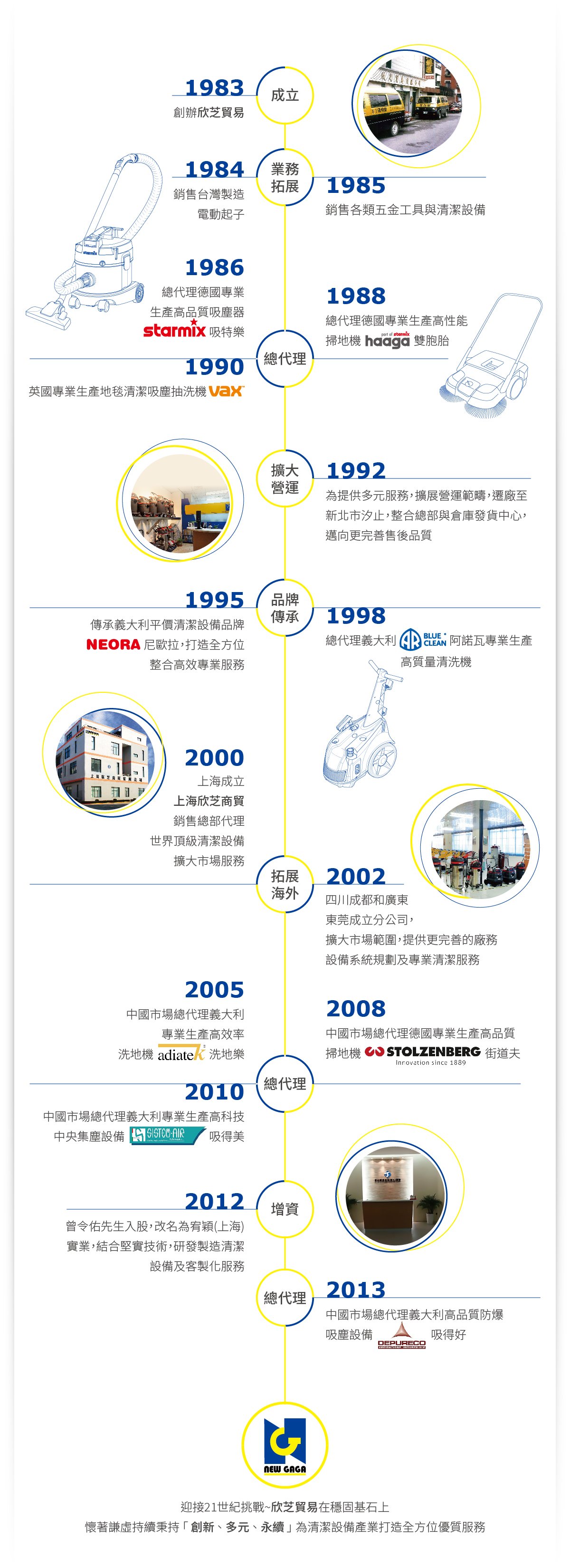 欣芝貿易於西元1983年由董事長劉世軒先生所創立,是全國首家代理,引進世界優質清潔設備品牌的先鋒。堅持品牌嚴選精神,讓我們多年來為無數客戶,提供環境問題的整體解決方案,以專業系列與高效率設備,符合產業實用性同時穩定耐用,深獲客戶肯定。