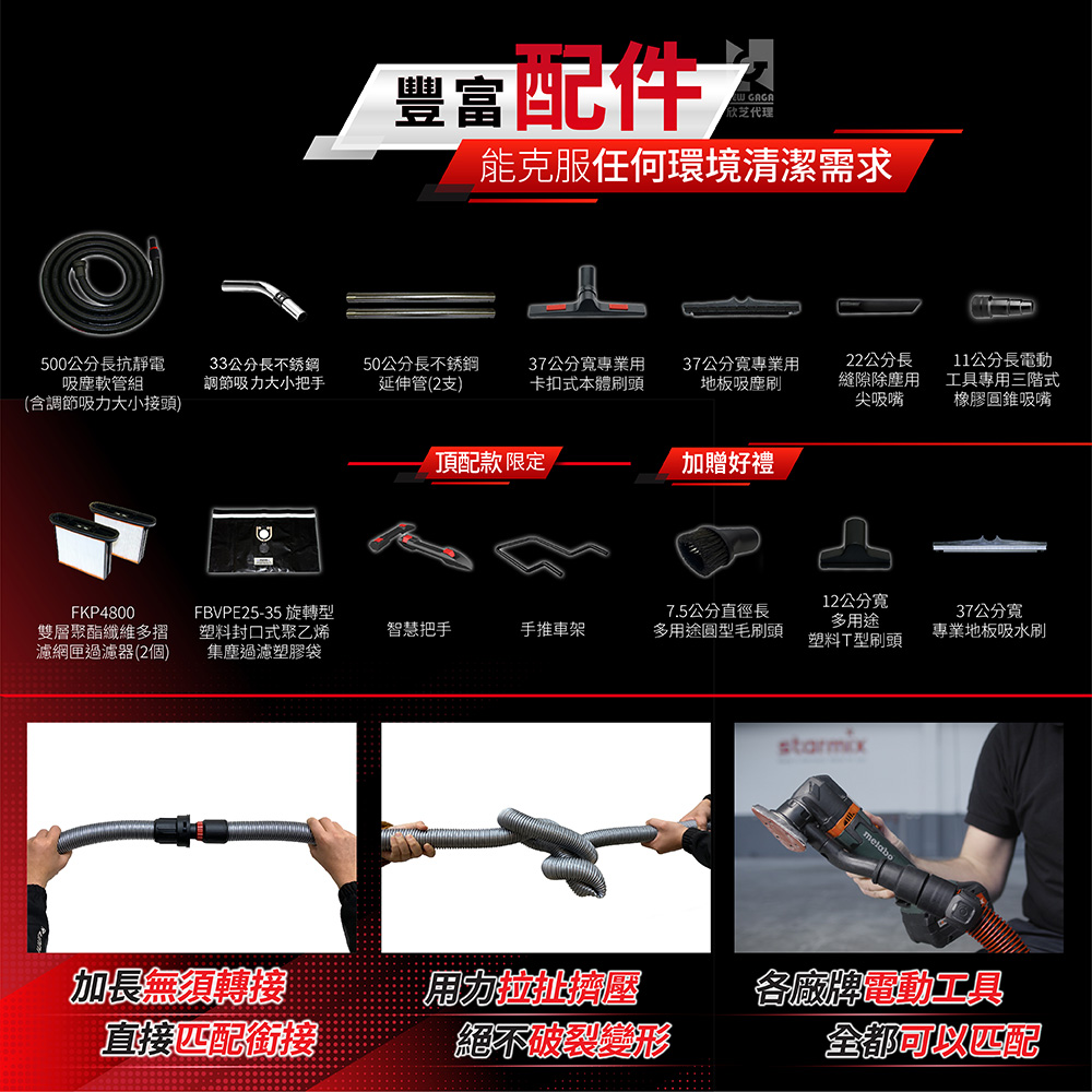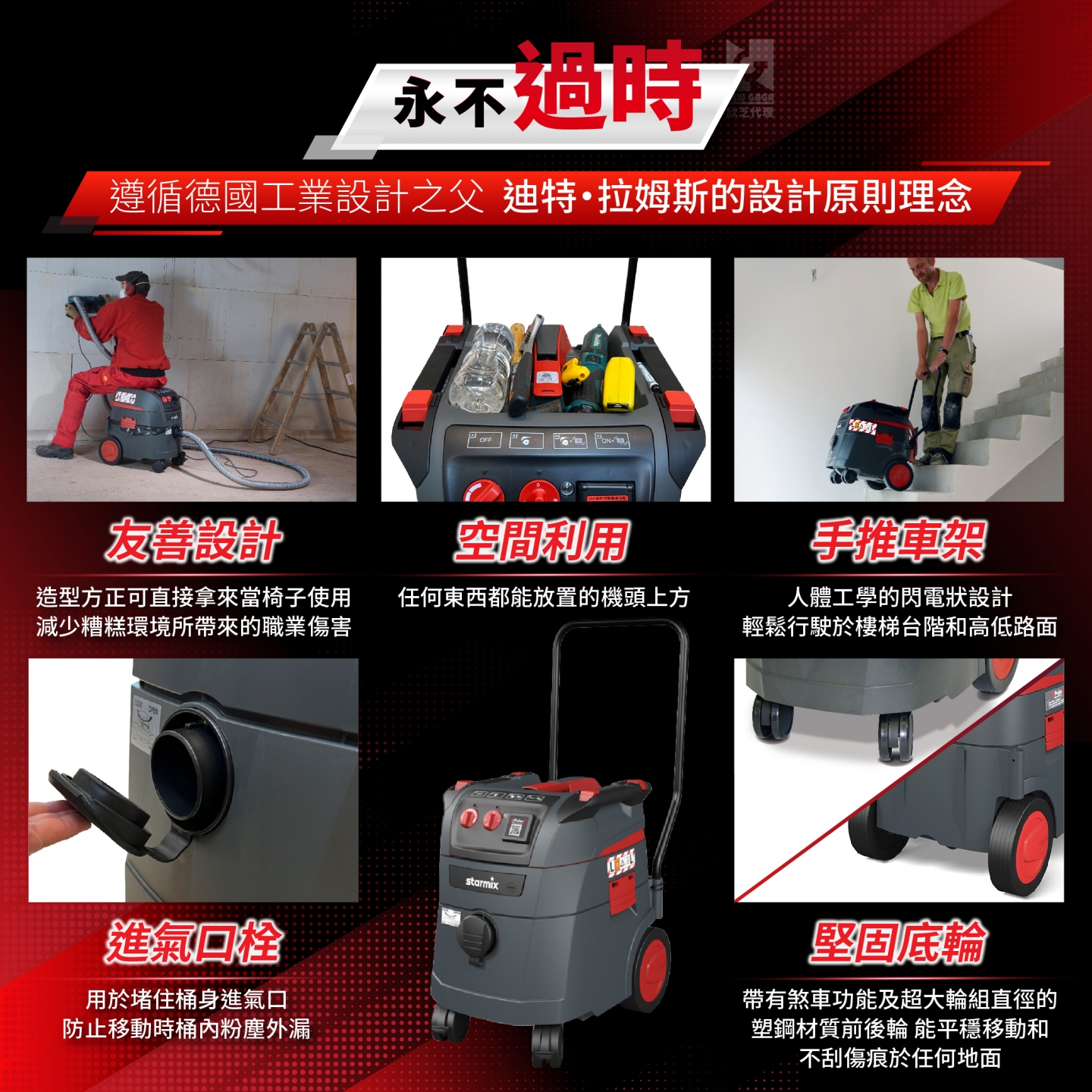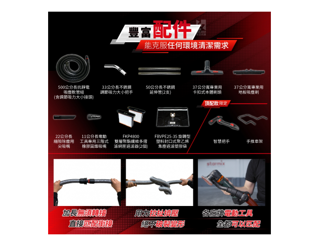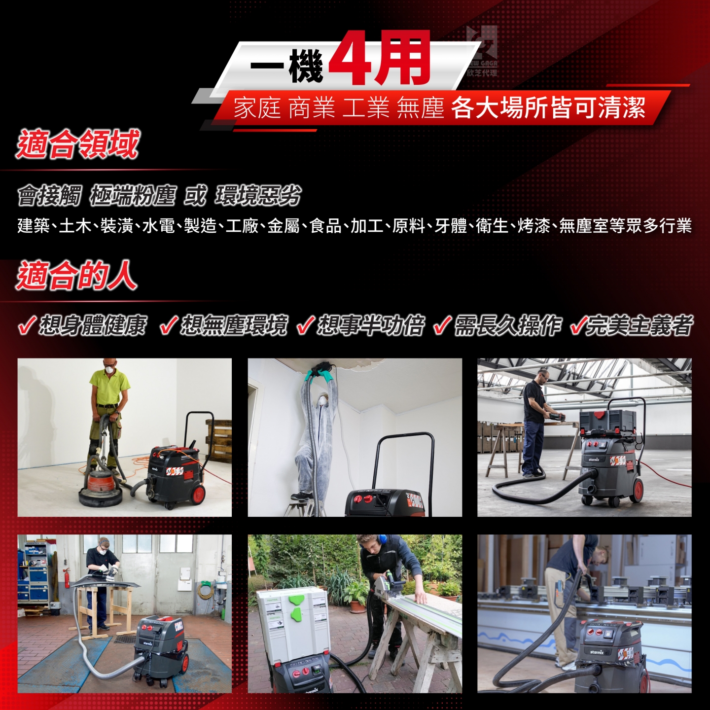 | 一機四用 | 家、商業、工業(極端粉末環境)、無塵(萬級以上等級),各大場所皆可清潔。 |