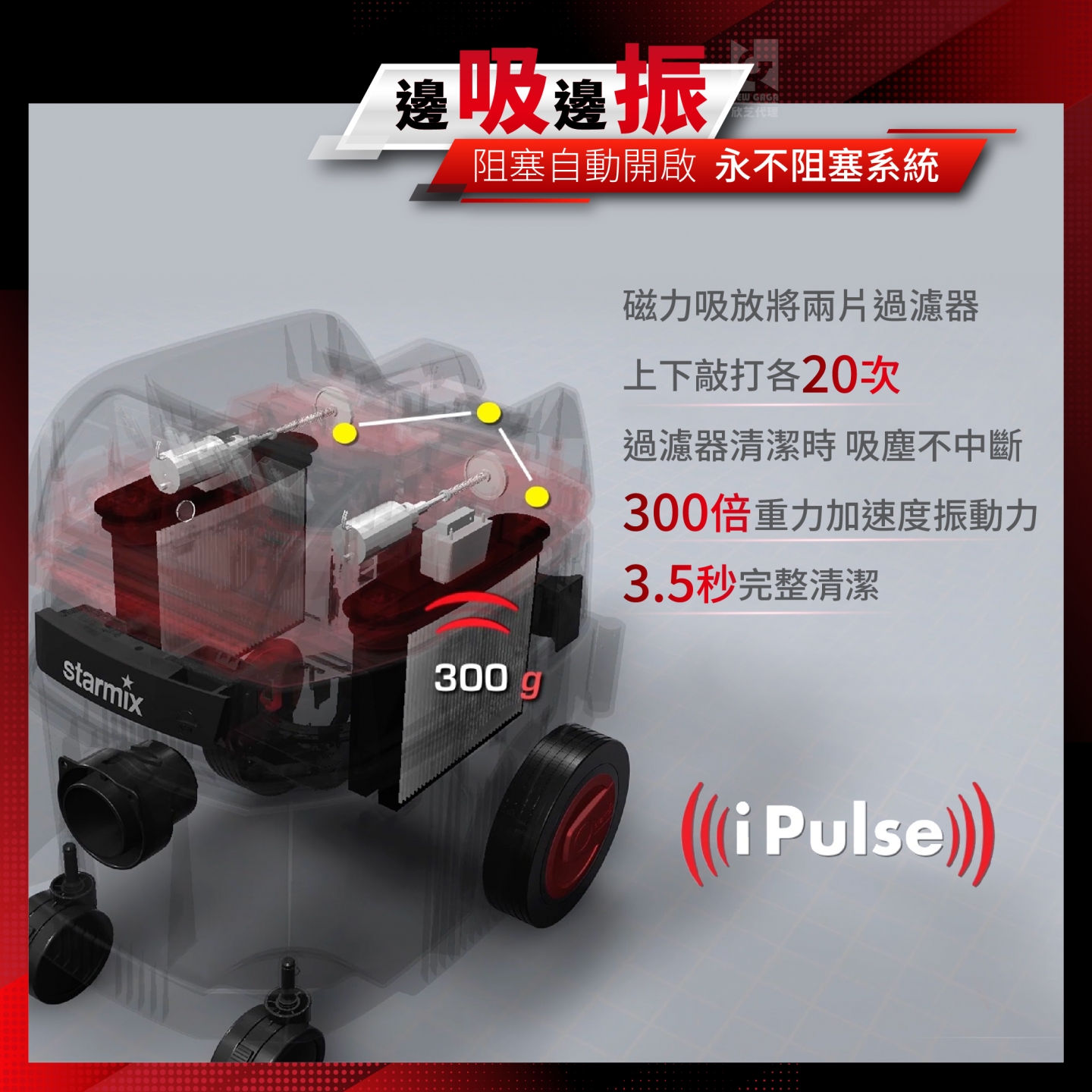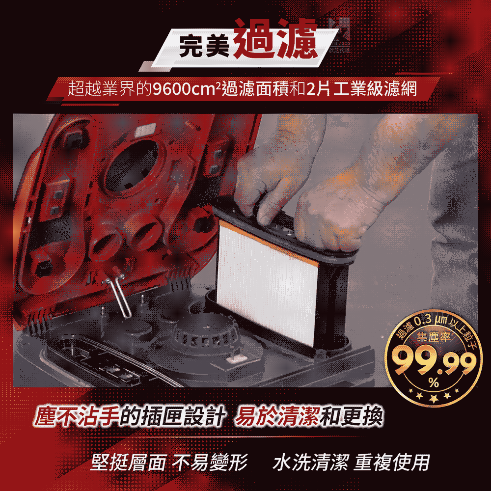 | 永不阻塞 | 專利發明,邊吸塵邊偵測,阻塞自動開啟電磁脈衝模式振動清潔過濾器,300倍重力加速度,3.5秒內完整清潔。 |