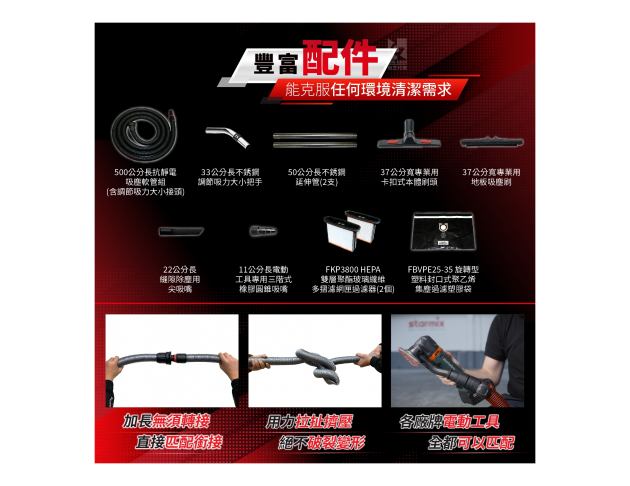 | 一機四用 | 家、商業、工業(極端粉末環境)、無塵(千級以上等級),各大場所皆可清潔。 |
