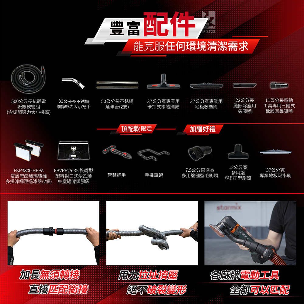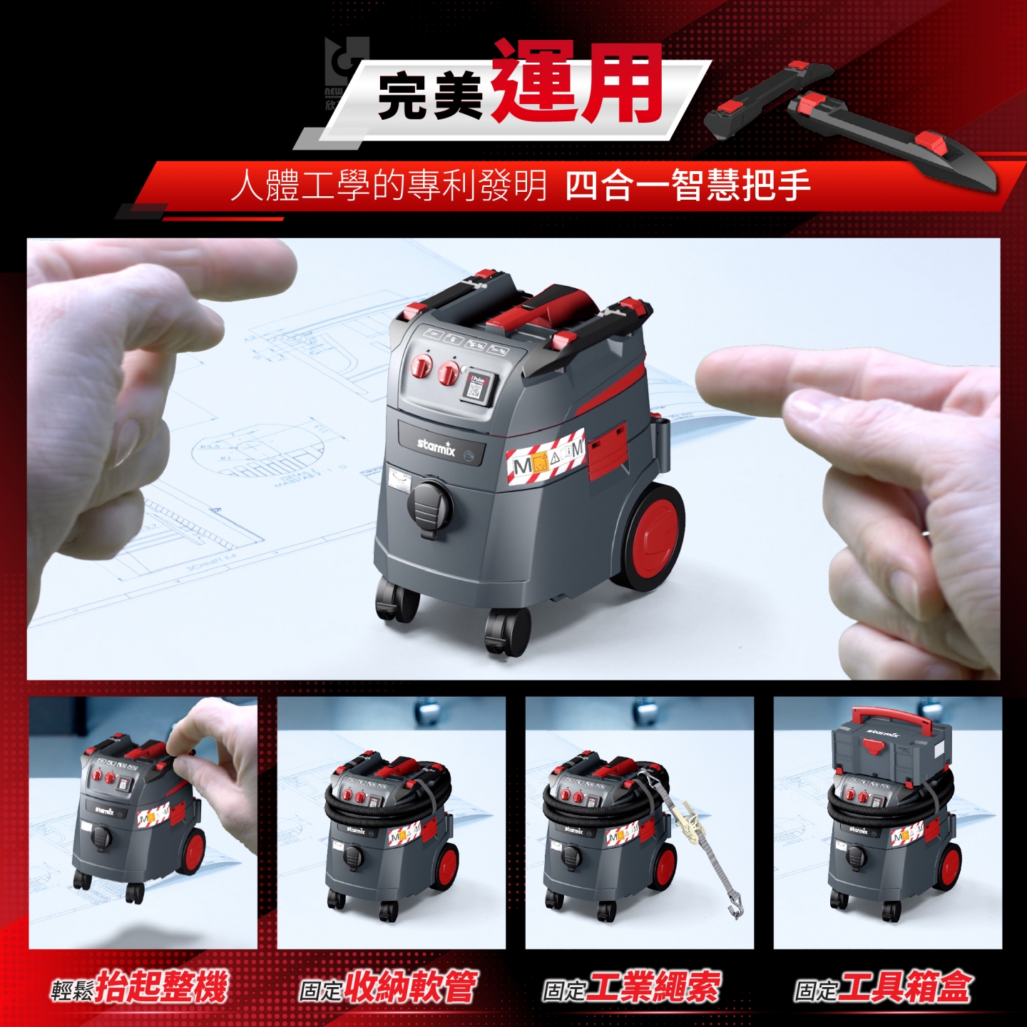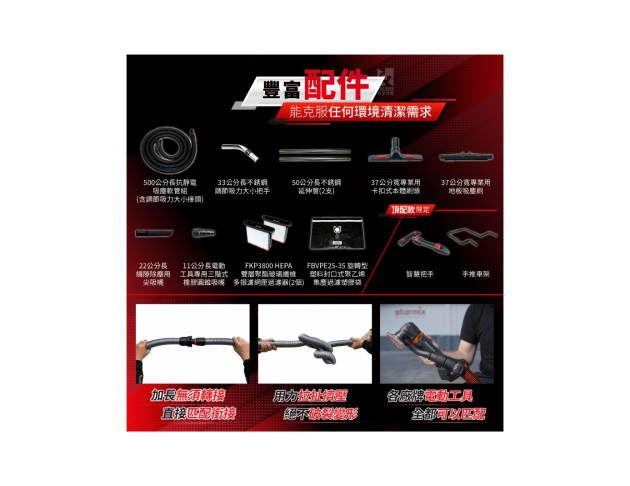 | 一機四用 | 家、商業、工業(極端粉末環境)、無塵(千級以上等級),各大場所皆可清潔。 |