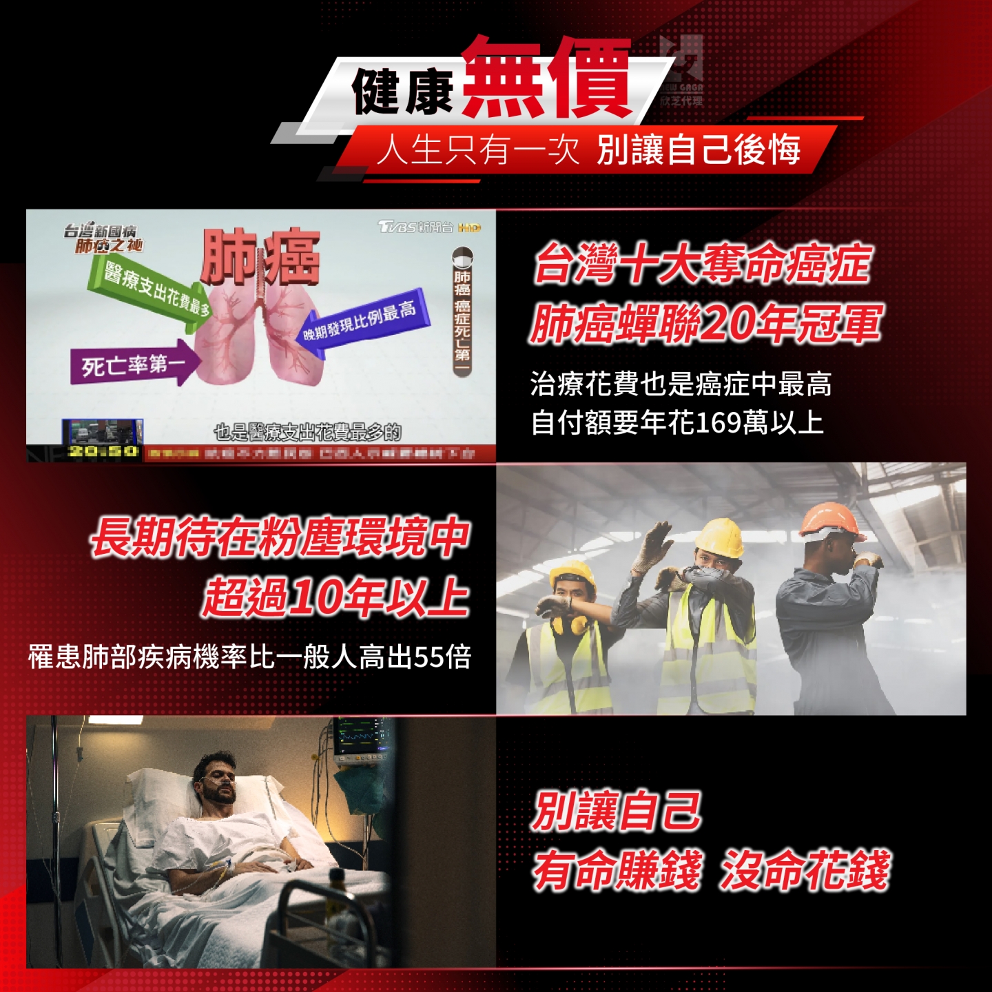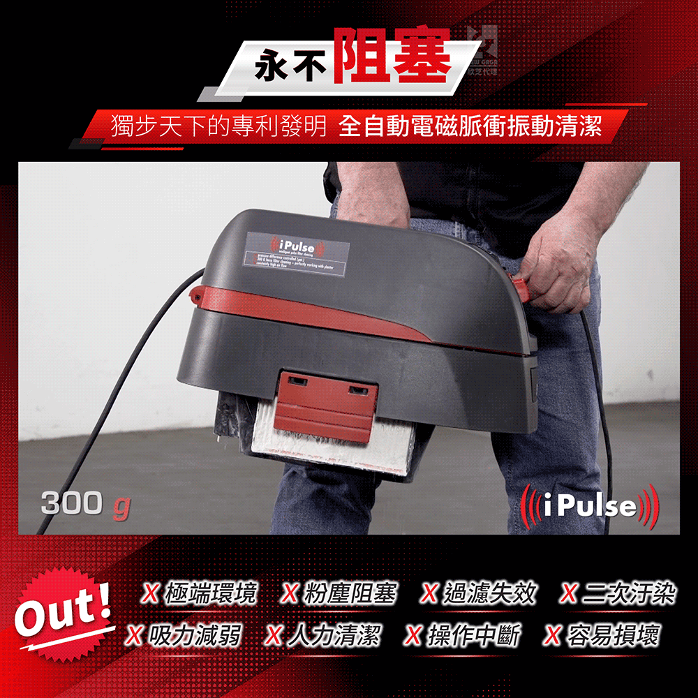 | 永不阻塞 | 專利發明,邊吸塵邊偵測,阻塞自動開啟電磁脈衝模式振動清潔過濾器,300倍重力加速度,3.5秒內完整清潔。 |