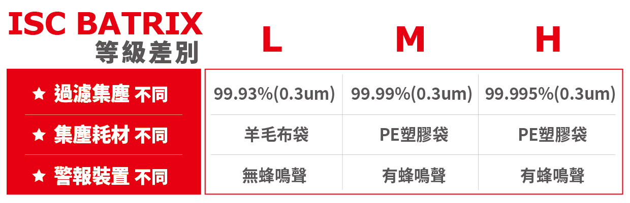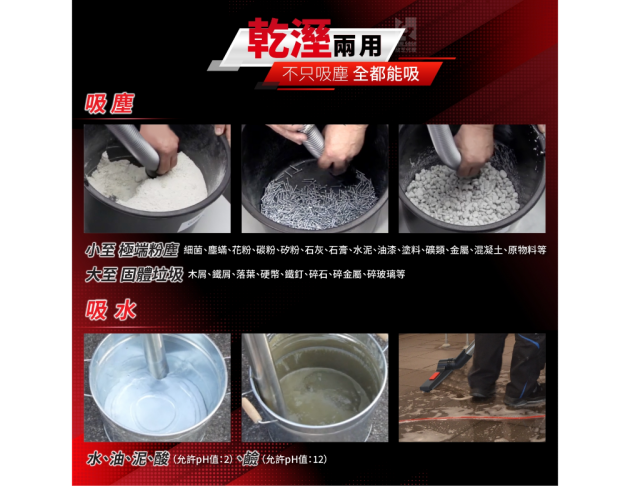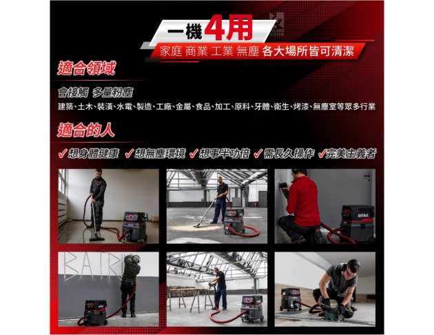 | 乾溼四用 | 乾溼發明者,吸塵、吸水、吸油、吸酸、吸鹼,家、商業、工業(多量粉末環境)、無塵(萬級以上等級)。 |