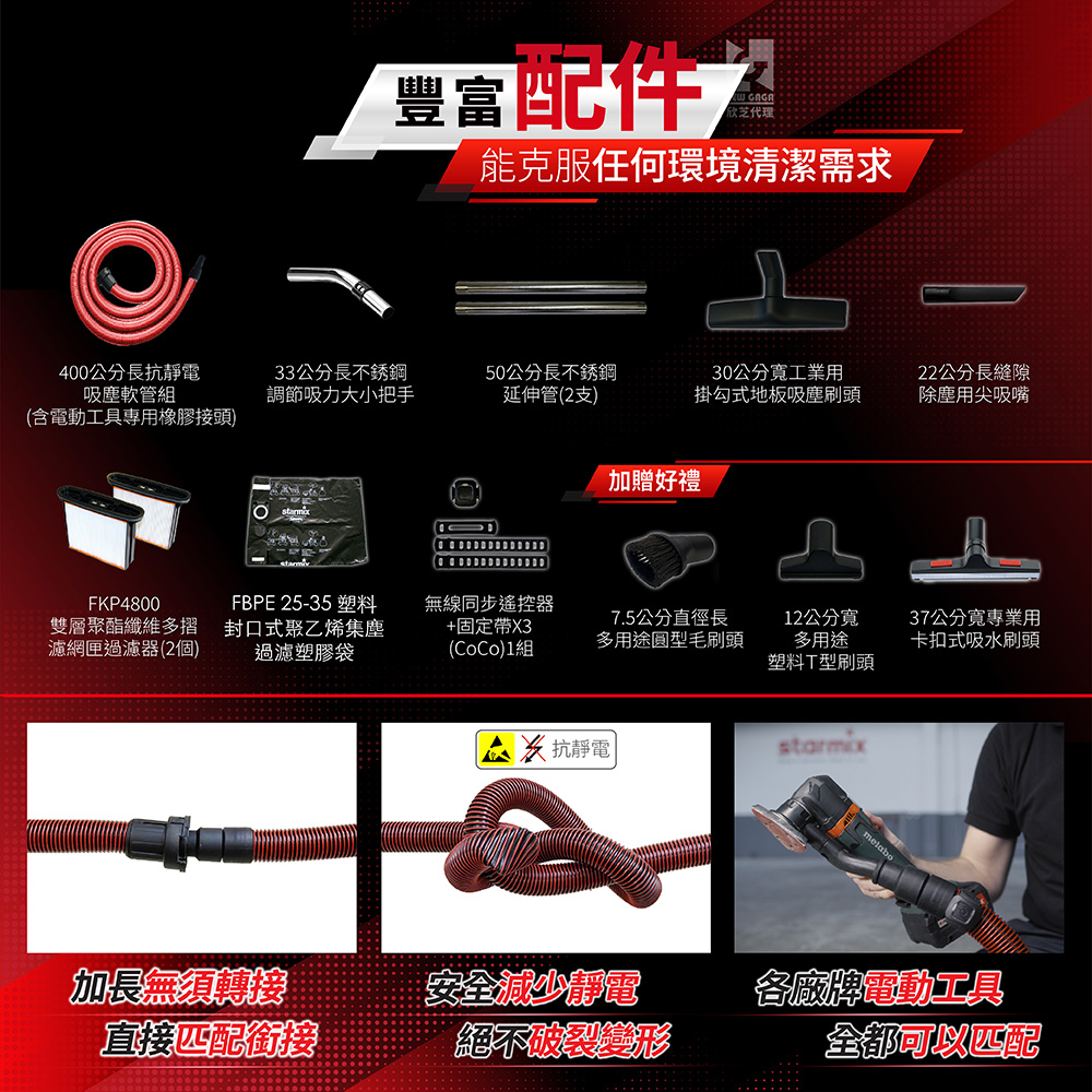 | 無線同步 | 專利發明,不受電源約束,透過電動工具運作,遠端自動同步連接啟動吸塵器開關,也可用手動方式連接。 |