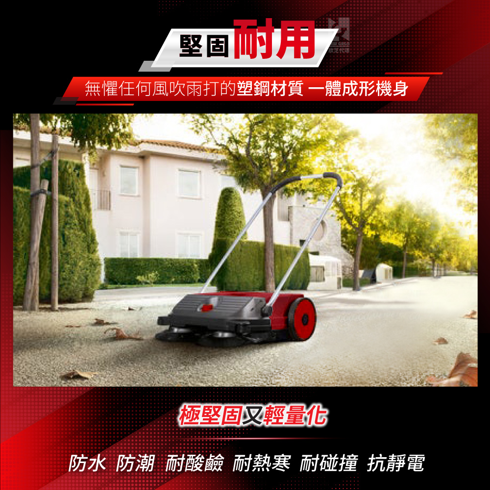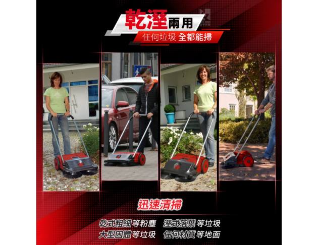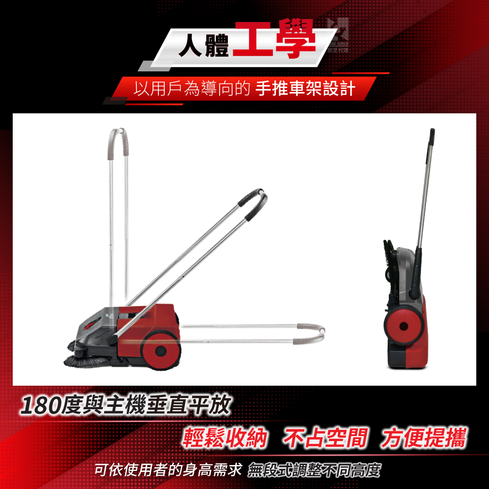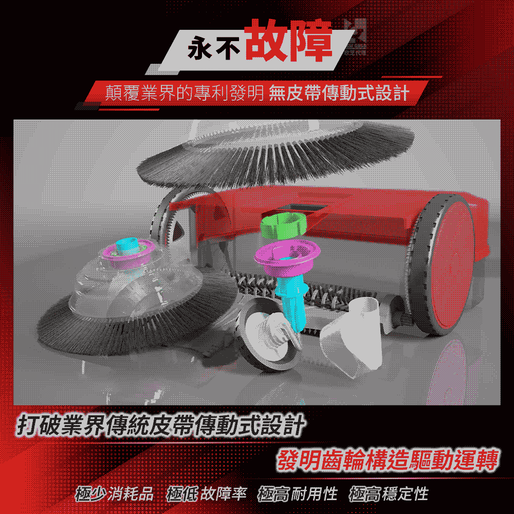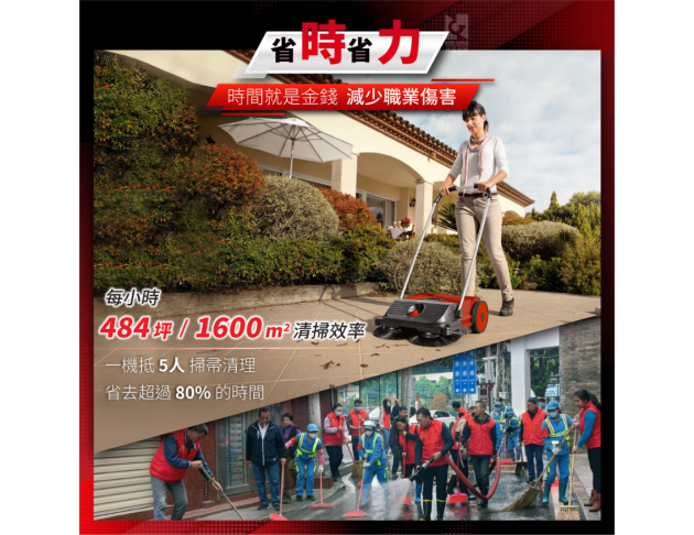 | 省時省⼒ | 免⽤電池、汽油、電線,⼿推驅動每⼩時484坪的清掃效率,⼀機抵5⼈使⽤傳統掃帚清理。 |