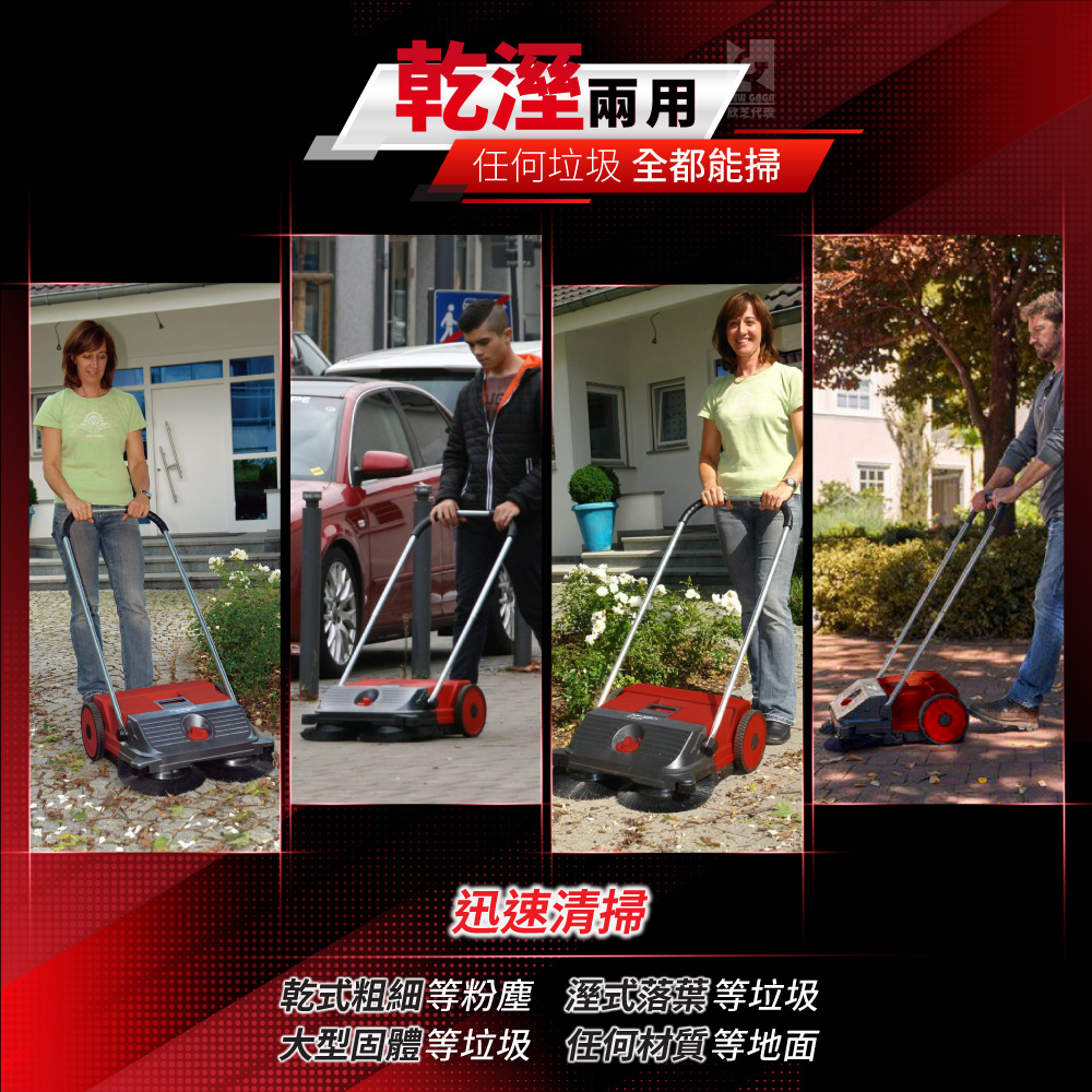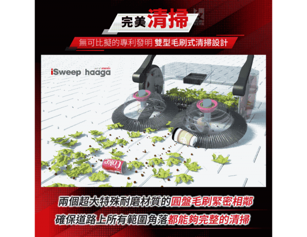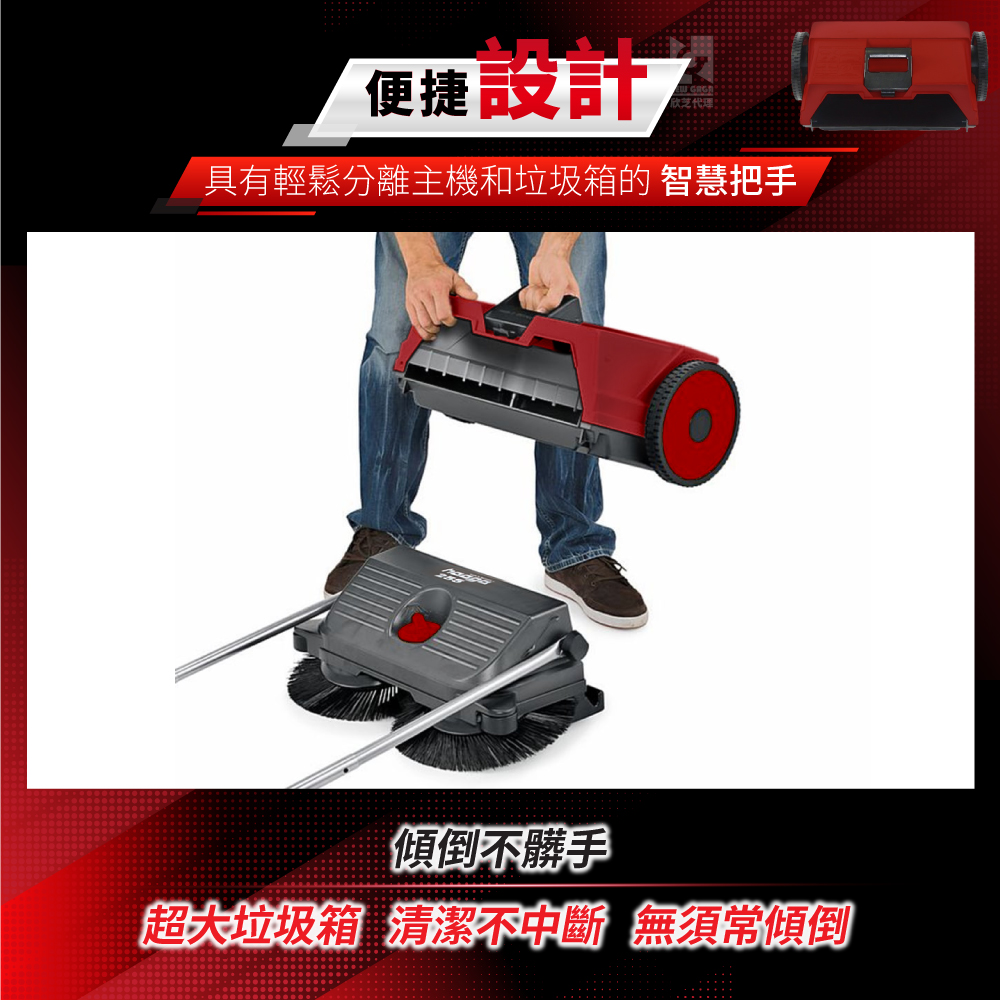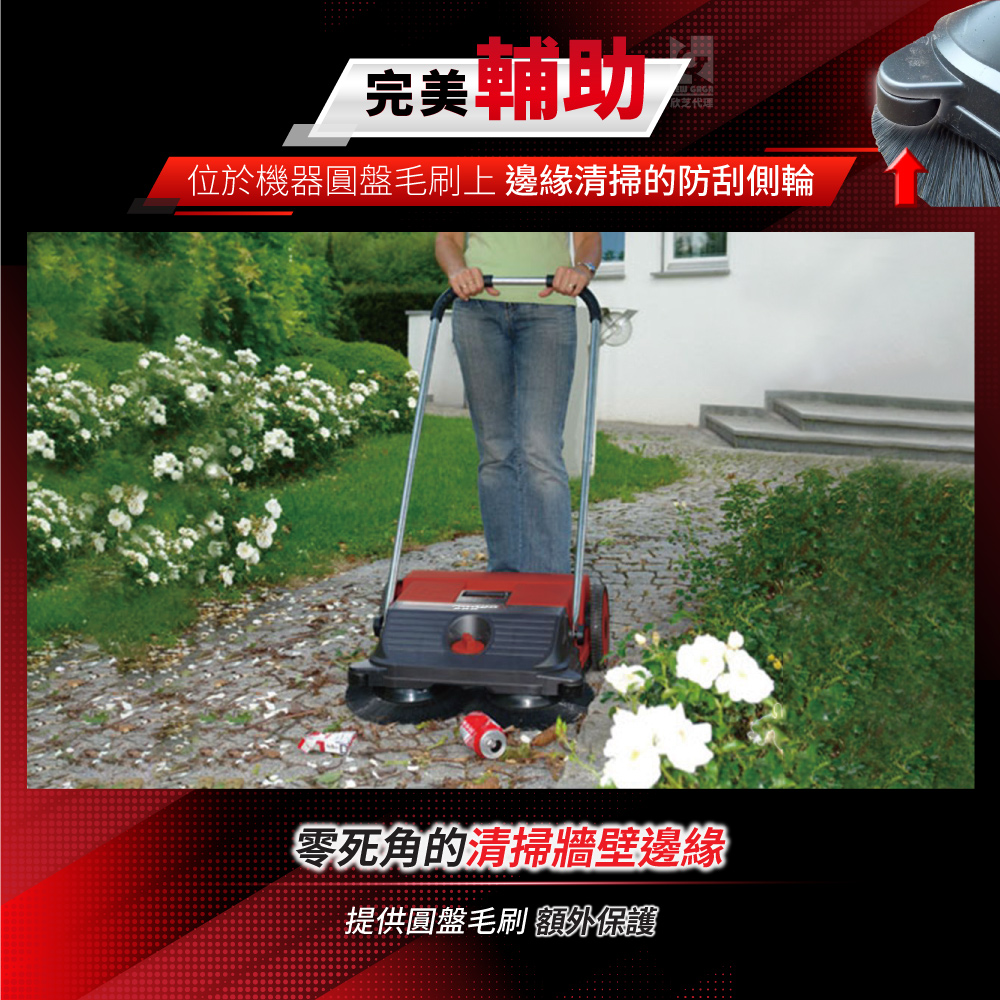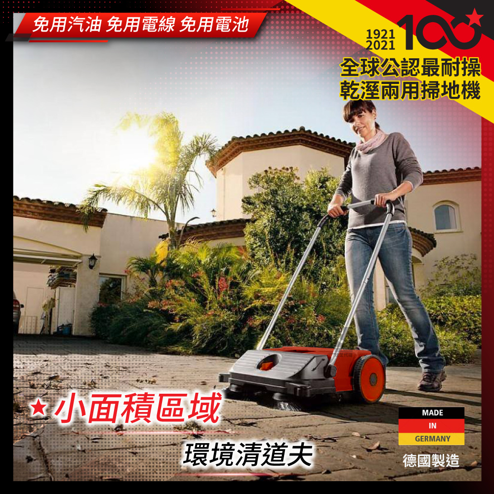 | 省時省⼒ | 免⽤電池、汽油、電線,⼿推驅動每⼩時484坪的清掃效率,⼀機抵5⼈使⽤傳統掃帚清理。 |