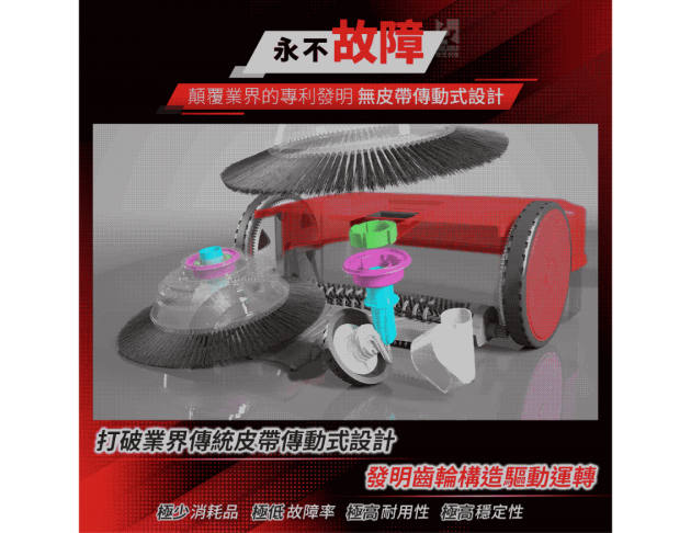 | 永不故障 | 專利發明,無⽪帶傳動設計,⿒輪構造驅動運轉,運⾏平穩順暢,超低故障率,超⾼耐⽤性。 |