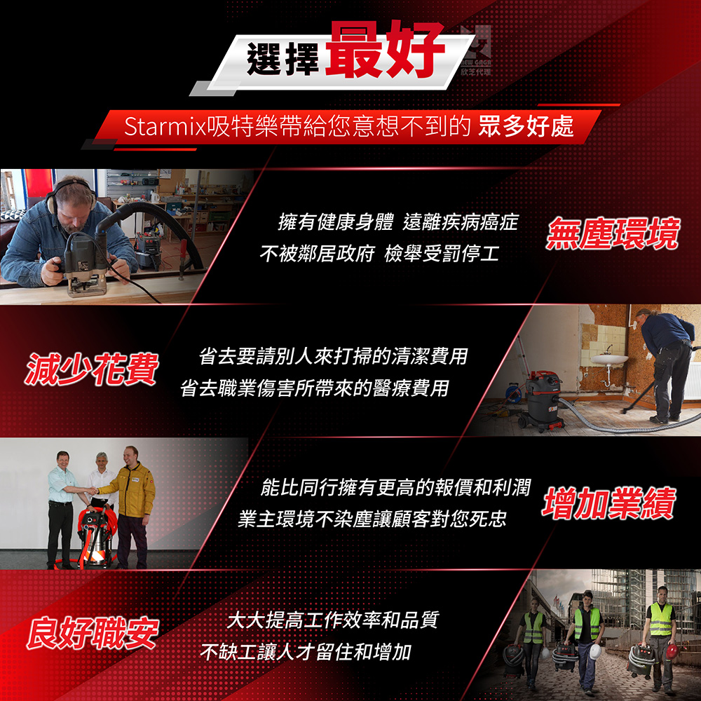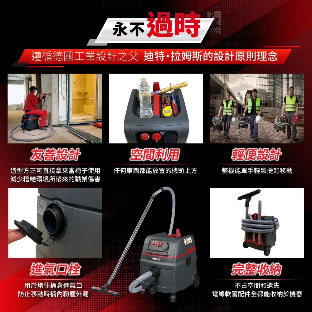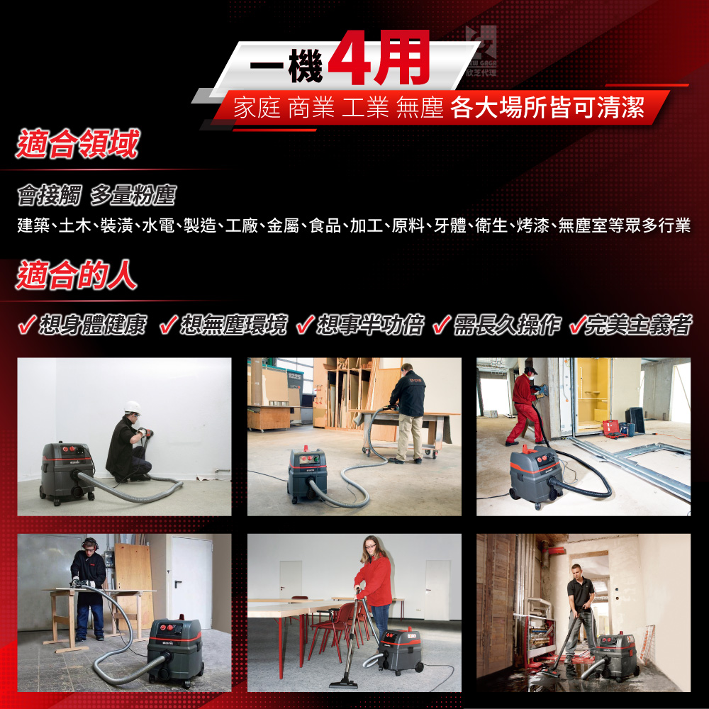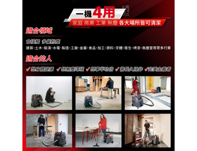 | 一機四用 | 家、商業、工業(多量粉末環境)、無塵(萬級以上等級),各大場所皆可清潔。 |
