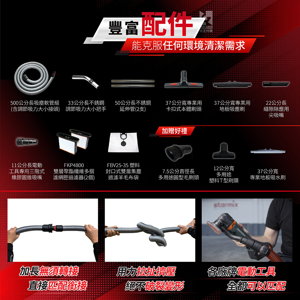 | 防爆軟管 | 歷經最嚴格拉扯測試的工業級多種耐磨材質吸塵軟管,耐破裂、耐擠壓、耐熱寒、耐酸鹼。 |