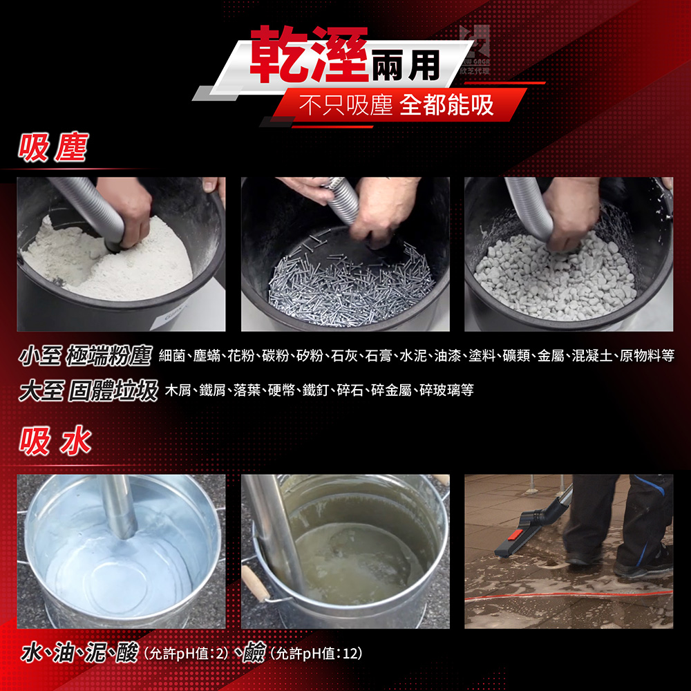 | 乾溼兩用 | 乾溼發明者,吸塵、吸水、吸油、吸酸、吸鹼,不再只有吸塵。 |