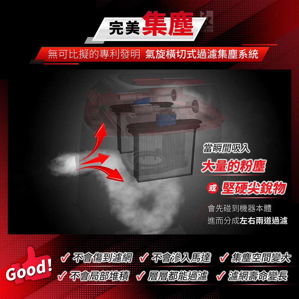 | 氣旋橫切 | 專利系統,過濾器平行放置於馬達左右兩邊,高效過濾集塵,超大過濾面積,能防止粉塵和液體滲入馬達裡。 |