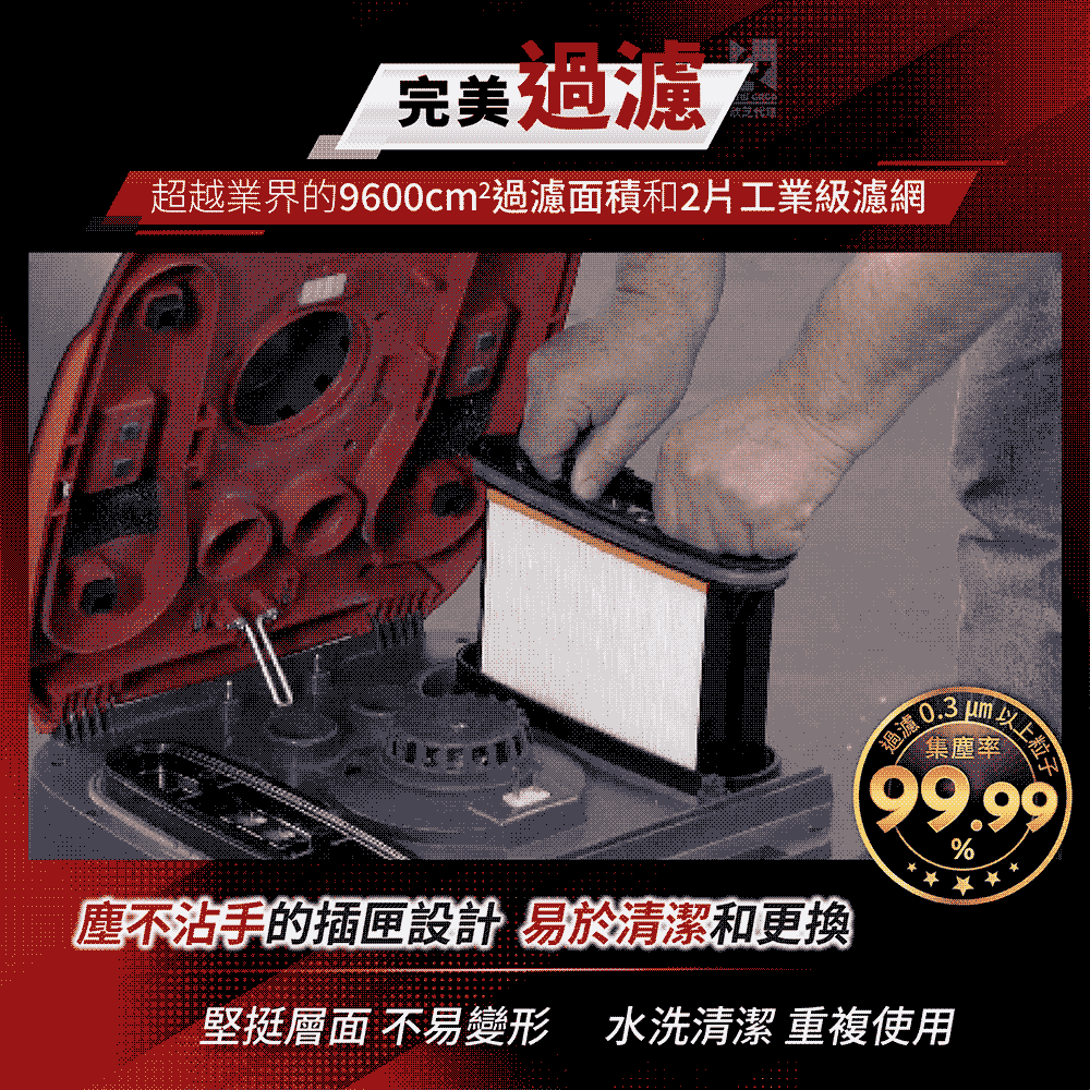 | 抗菌濾網 | 塵不沾手的插匣構造,易於清潔和更換,過濾小至細菌、塵螨、工業細粉等,大至木屑、落葉、玻璃碎片等。 |