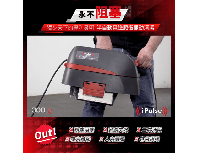 | 永不阻塞 | 專利發明,吸塵結束,手按開啟電磁脈衝模式振動清潔過濾器,300倍重力加速度振動力,8秒內完整清潔。 |