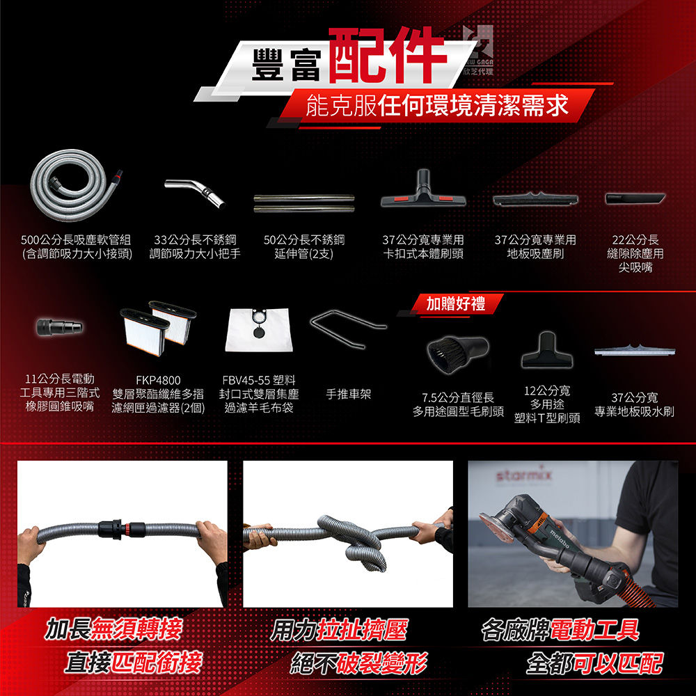| 防爆軟管 | 歷經最嚴格拉扯測試的工業級多種耐磨材質吸塵軟管,耐破裂、耐擠壓、耐熱寒、耐酸鹼。 |