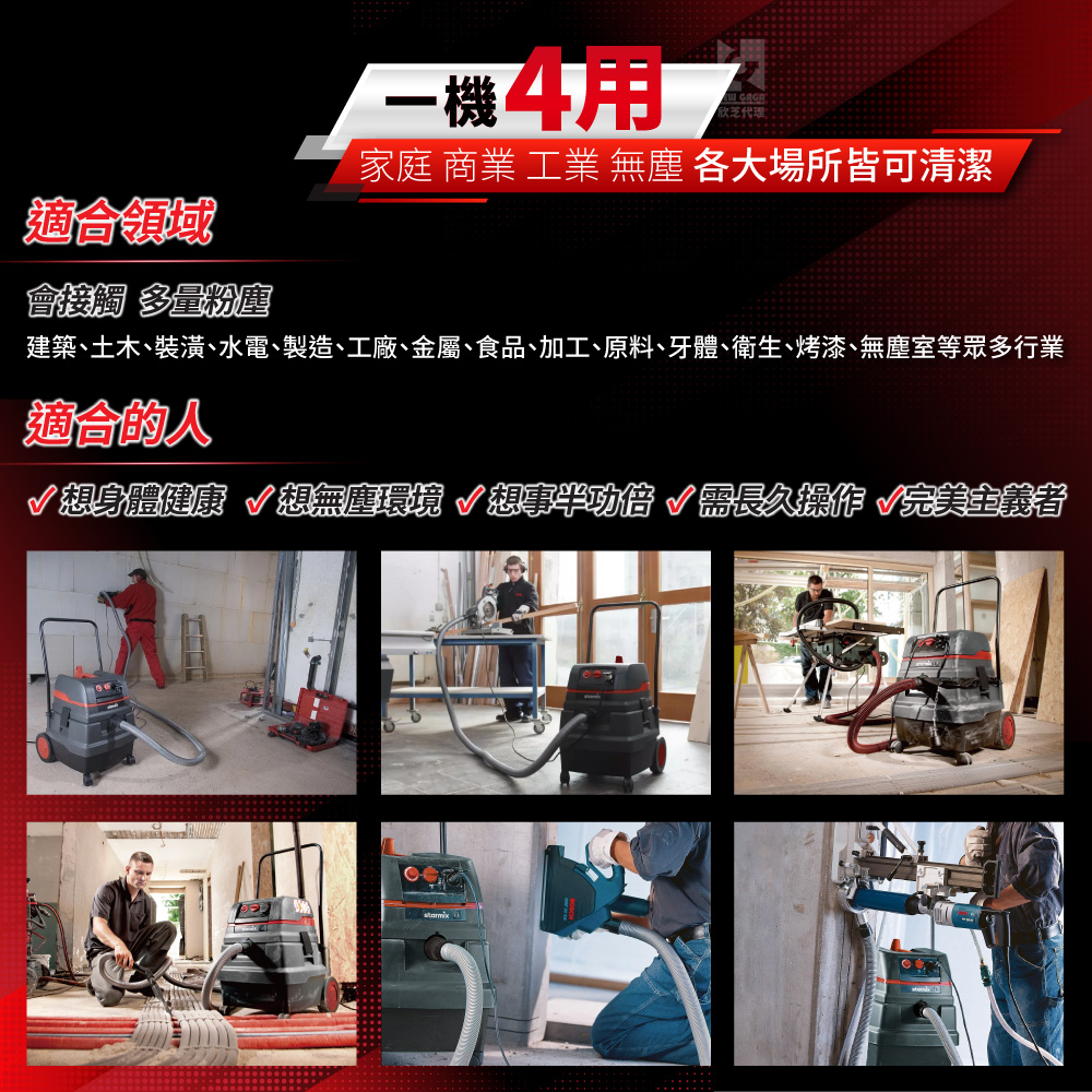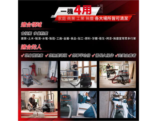 | 一機四用 | 家、商業、工業(多量粉末環境)、無塵(萬級以上等級),各大場所皆可清潔。 |