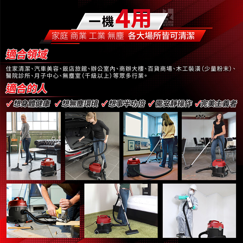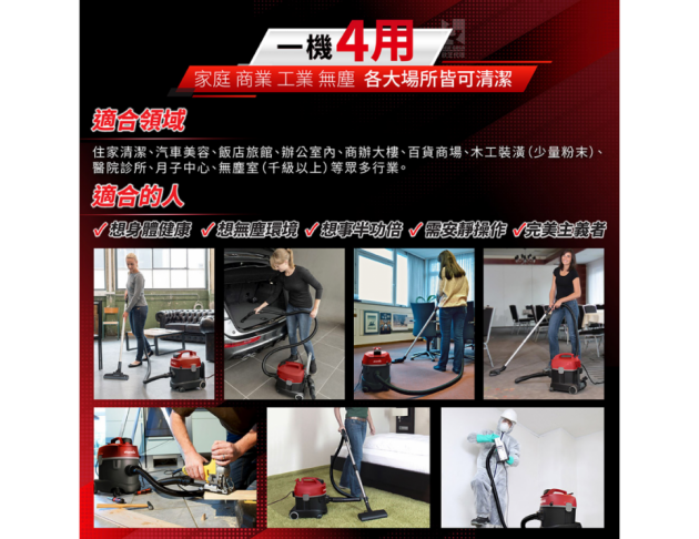 | 一機四用 | 家庭、商業、工業(少量粉末環境)、無塵(千級以上等級),各大場所皆可清潔。 |