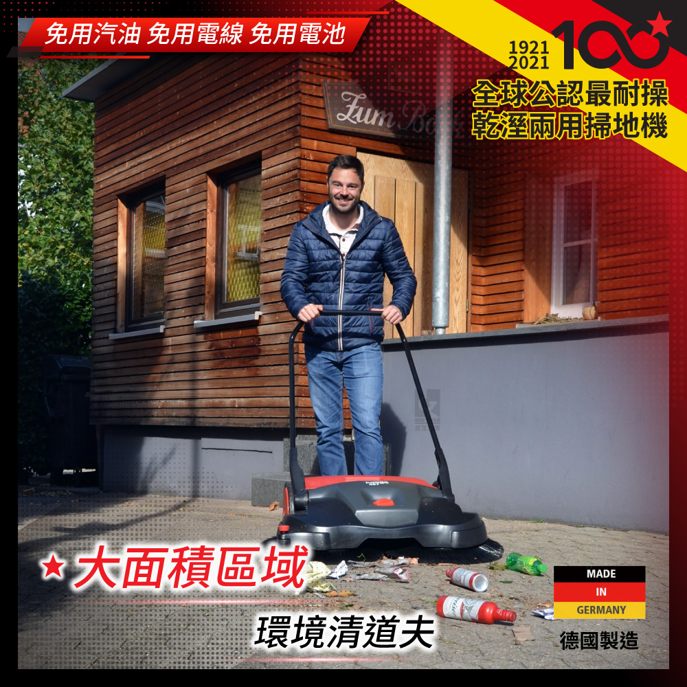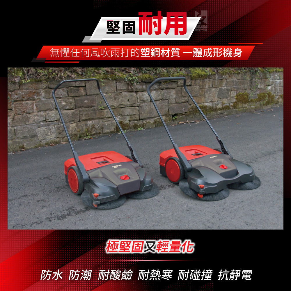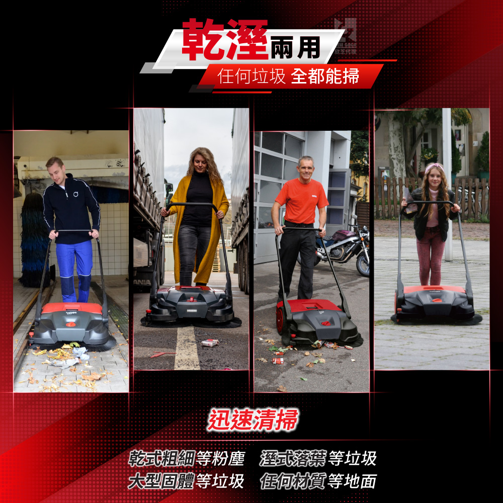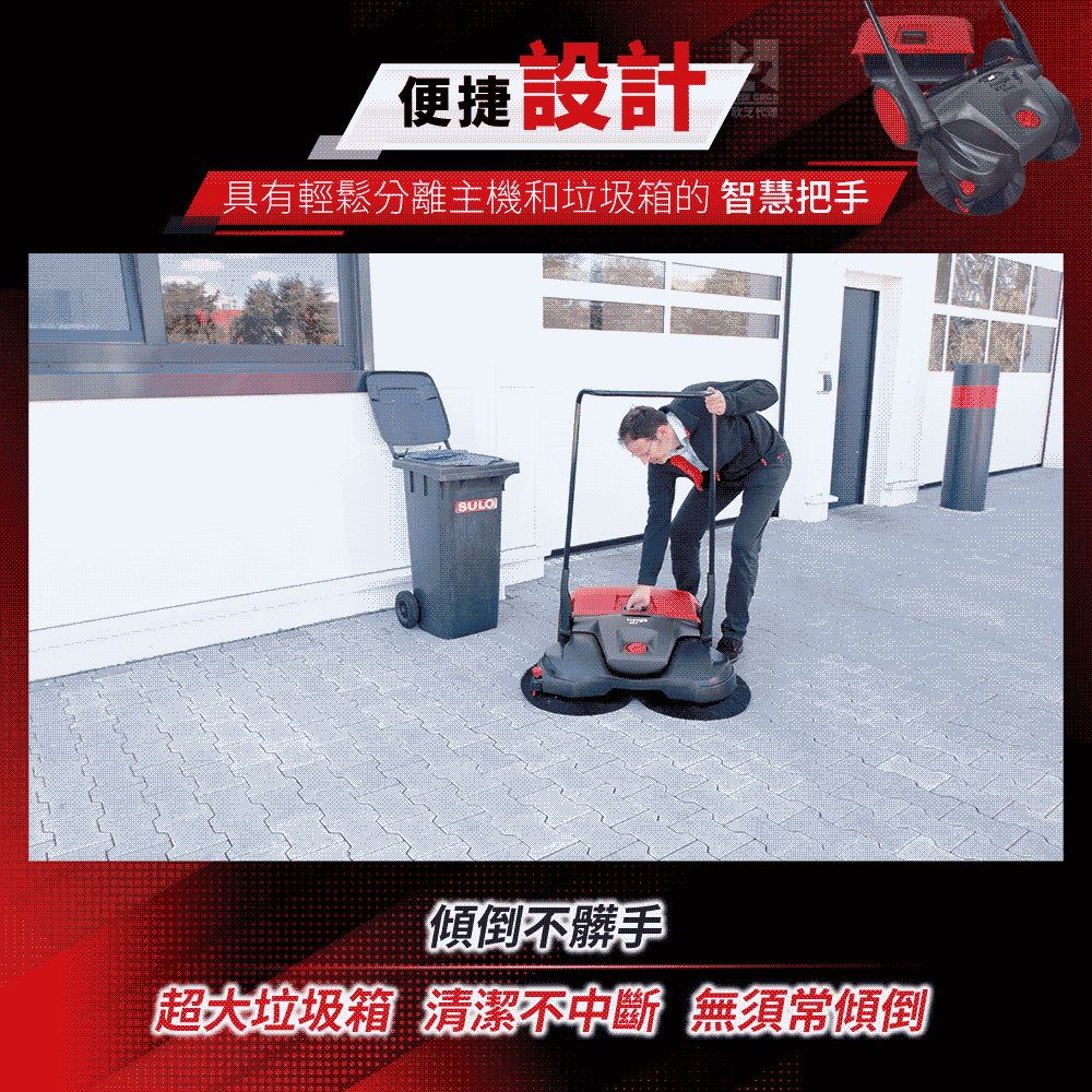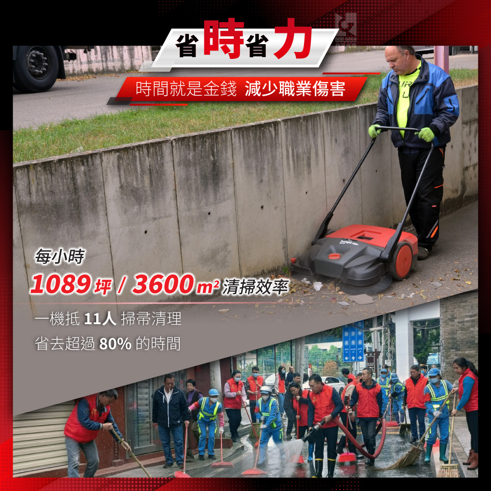 | 省時省⼒ | 免⽤電池、汽油、電線,⼿推驅動每⼩時1089坪的清掃效率,⼀機抵11⼈使⽤傳統掃帚清理。 |