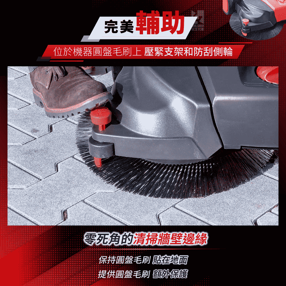 | 電力驅動 | 能使圓盤毛刷和滾輪刷頭高速旋轉運行,比手推驅動更快速乾淨的清掃效率,更省時省力的清掃操作。 |