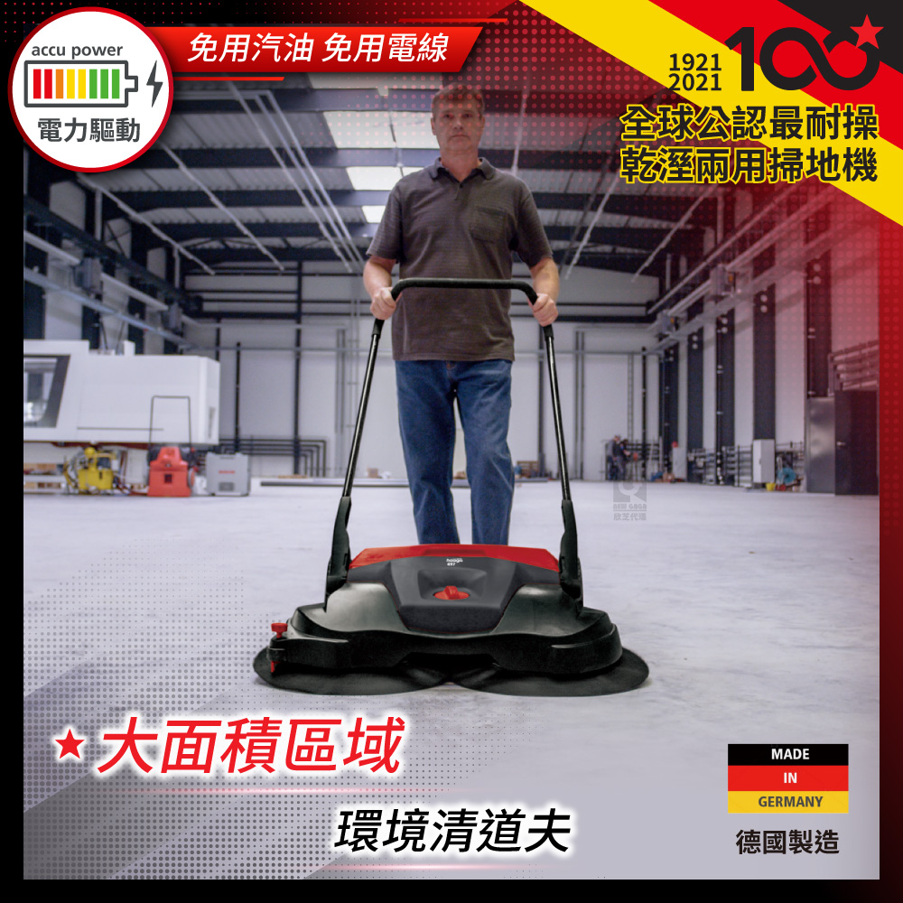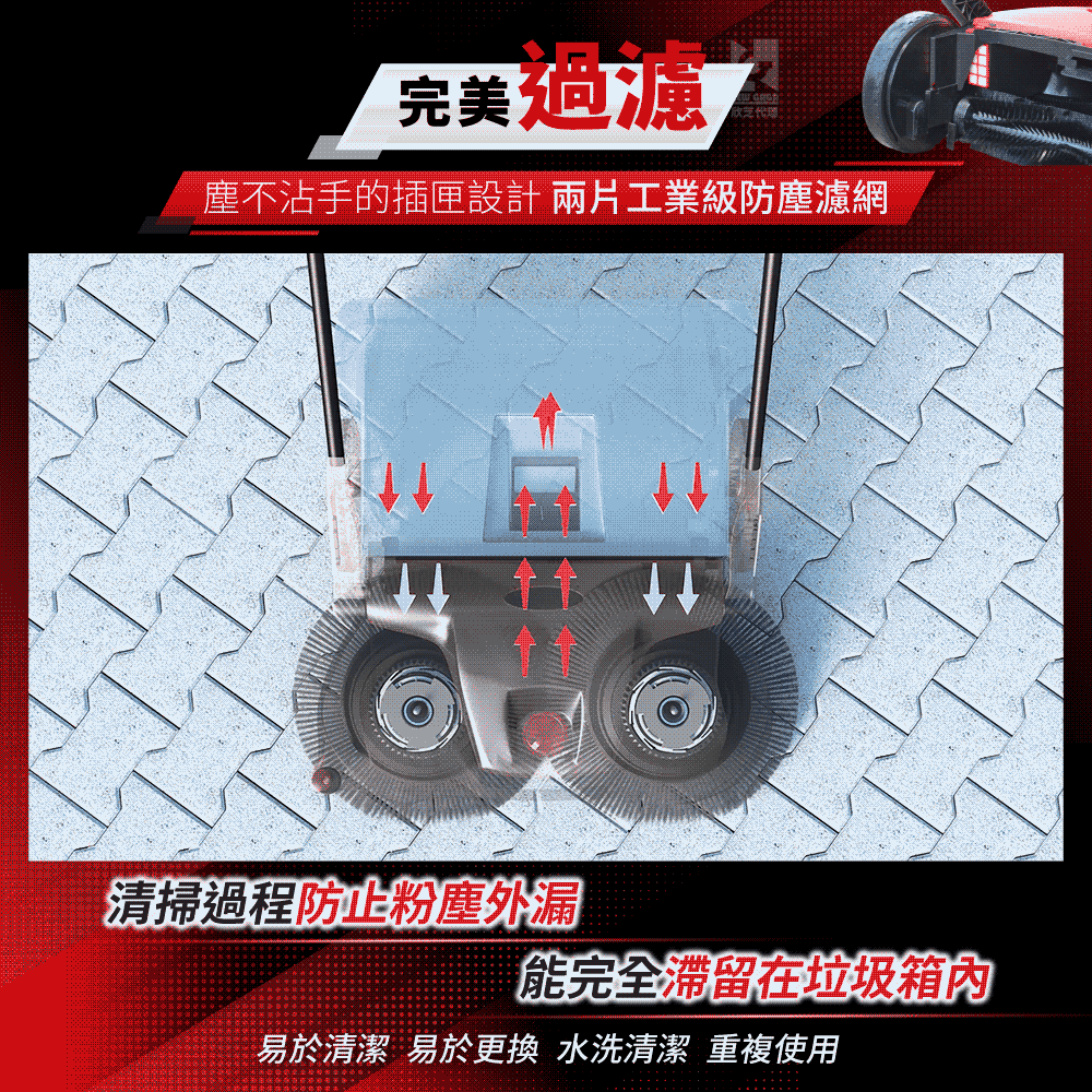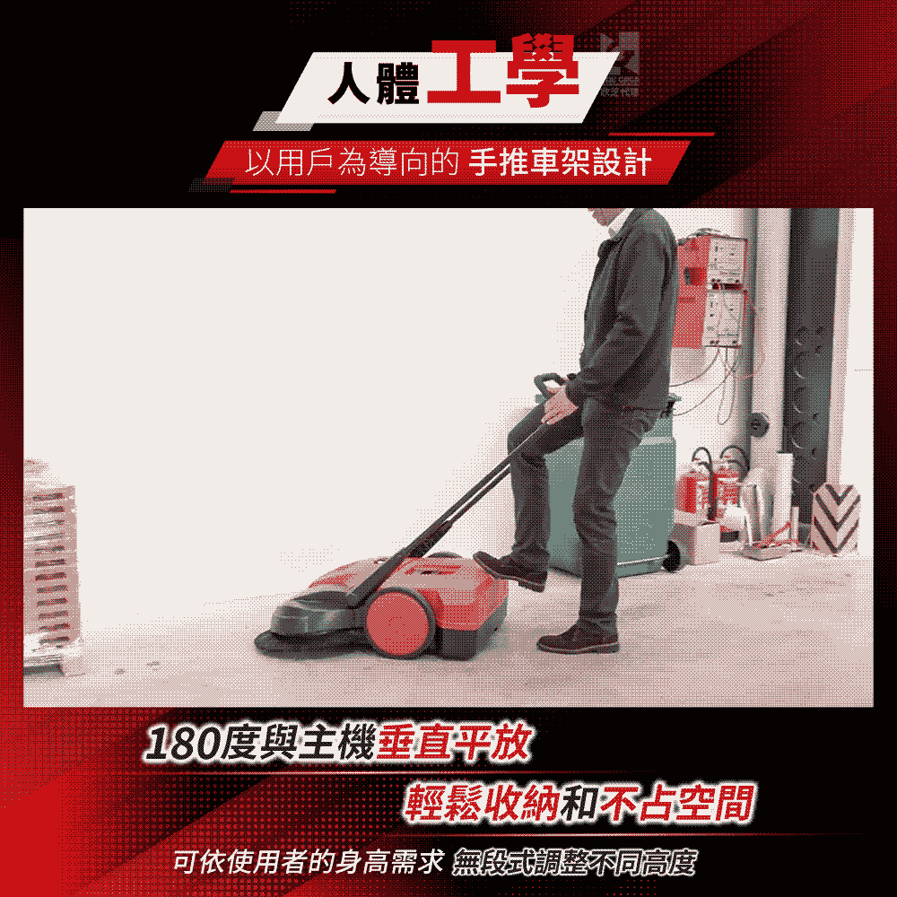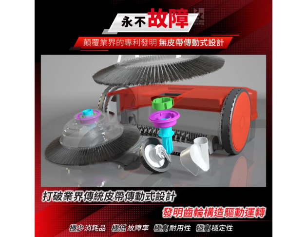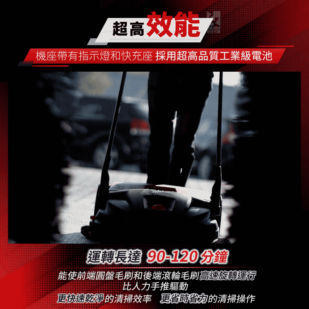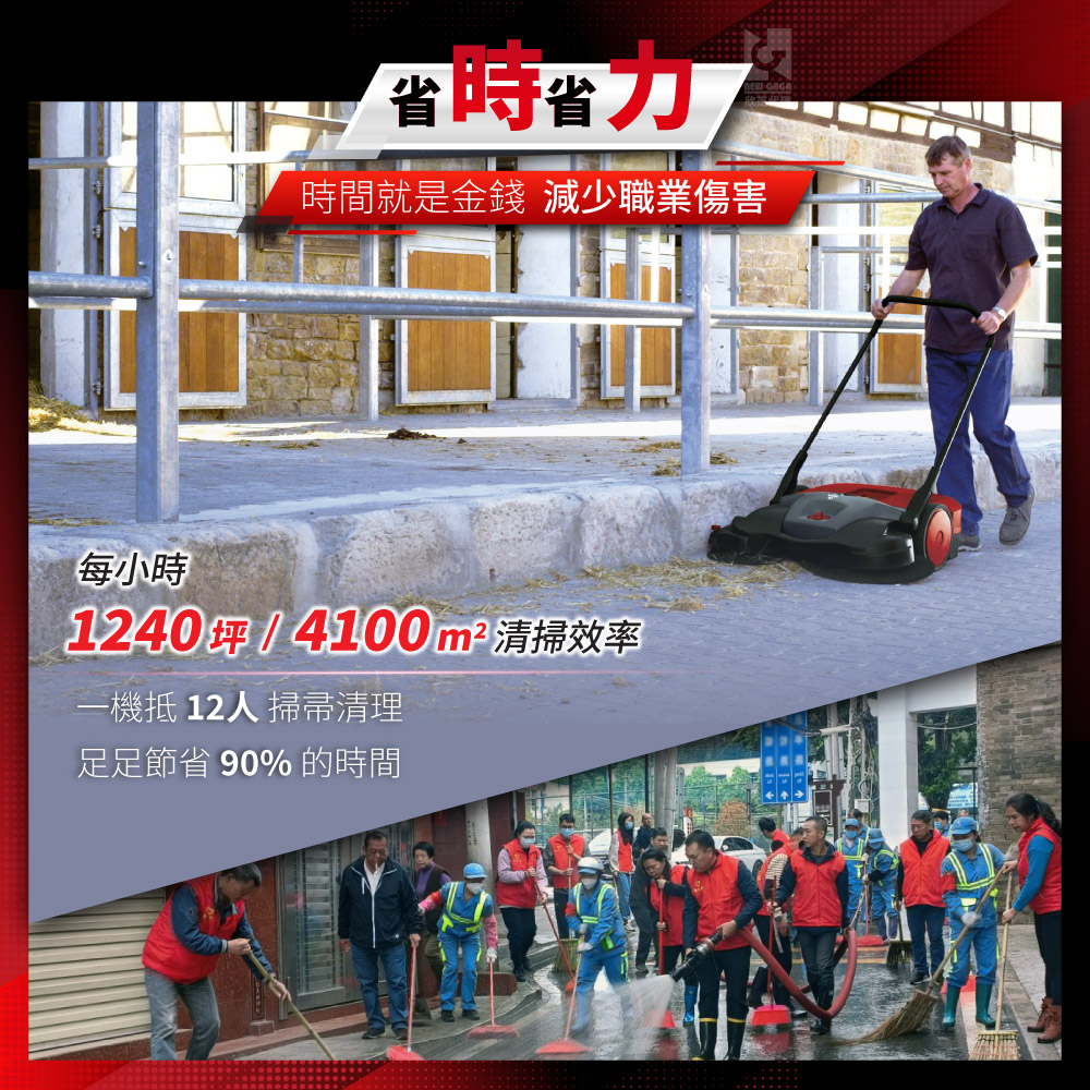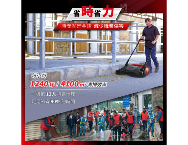 | 省時省力 | 免用汽油、電線,手推電力驅動每小時1240坪的清掃效率,一機抵12人使用傳統掃帚清理,足足節省90%時間。 |