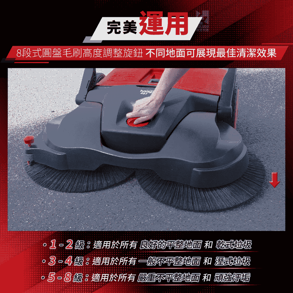 | 刷高調整 | 8段式圓盤毛刷高度調整,不同地面可展現最佳清潔效果。 |