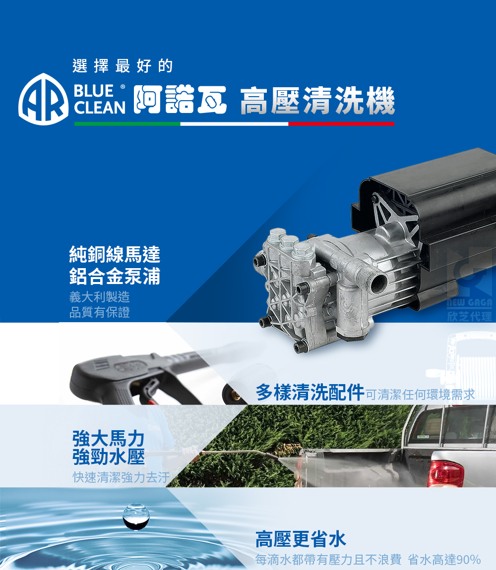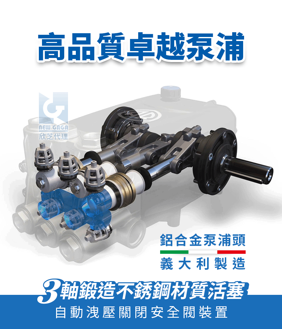 | 卓越泵浦 | 義大利製斜盤式泵浦,鋁製頭3軸鍛造不銹鋼活塞,具有自動洩壓關閉安全閥閥裝置。 |