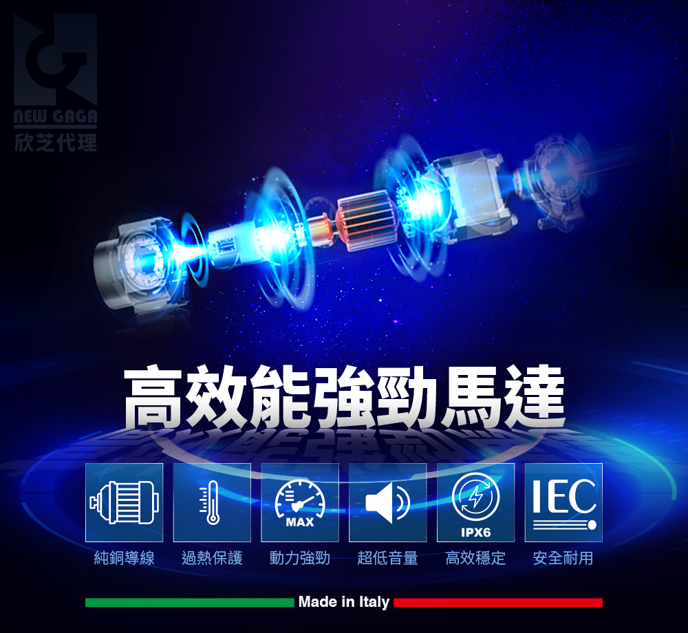 | 高效馬達 | 義大利製渦輪增壓馬達,降噪設計、純銅導線、強勁動力、穩定輸出、安全耐用。 |