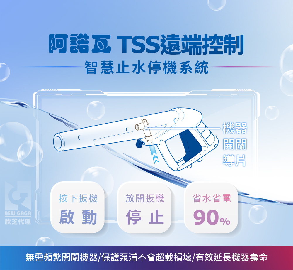 | 遠端控制 | TSS遠端控制智慧止水停機系統,按下扳機即啟動放開即停止,能省水省電和保護主機不會超載損壞。 |