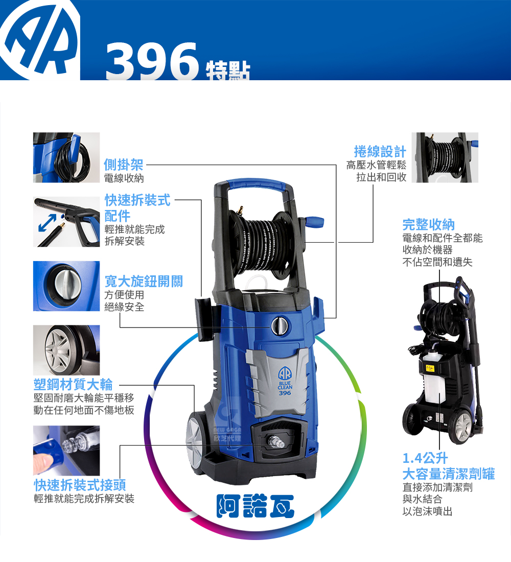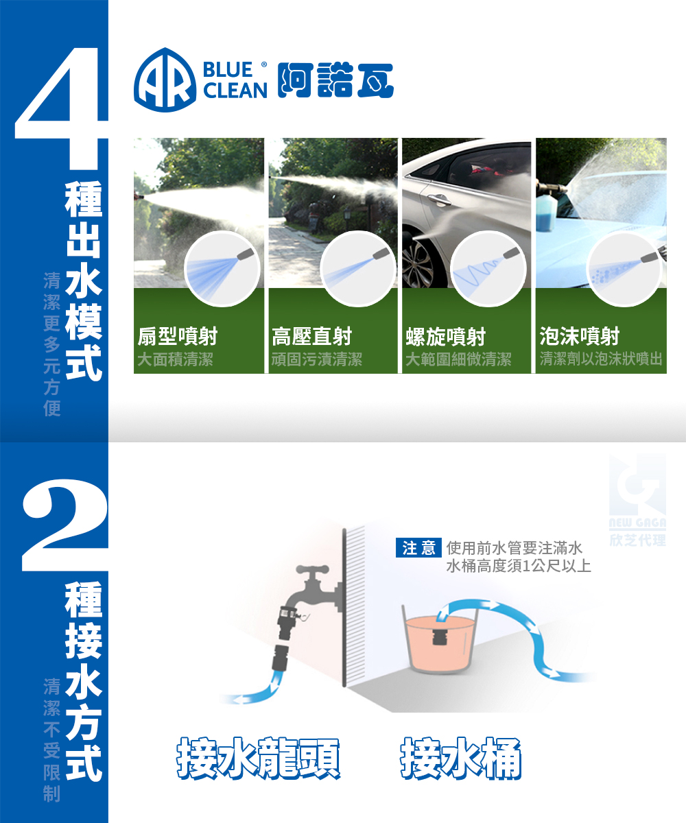 | 四種出水 | 能清潔任何環境需求,四種噴射模式:高壓/扇型/螺旋/泡沫。 |