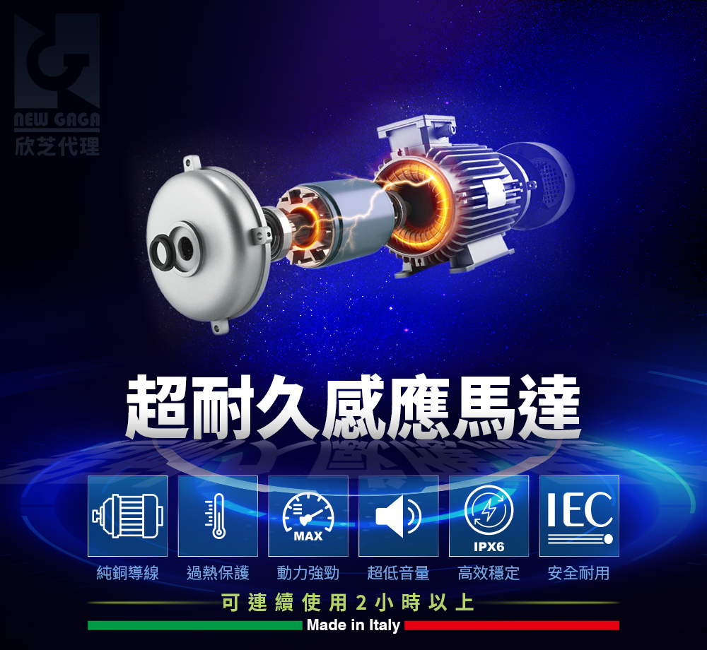 | 感應馬達 | 義大利製耐久感應馬達,可連續使用2小時以上,低噪設計、純銅導線、強勁動力、穩定輸出、安全耐用。 |